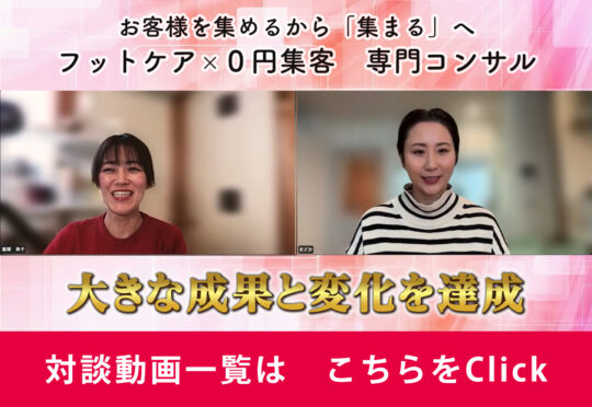 「フットケア×0円集客」を受講された方の口コミ・評価をインタビュー動画にてご紹介させていただきます。
